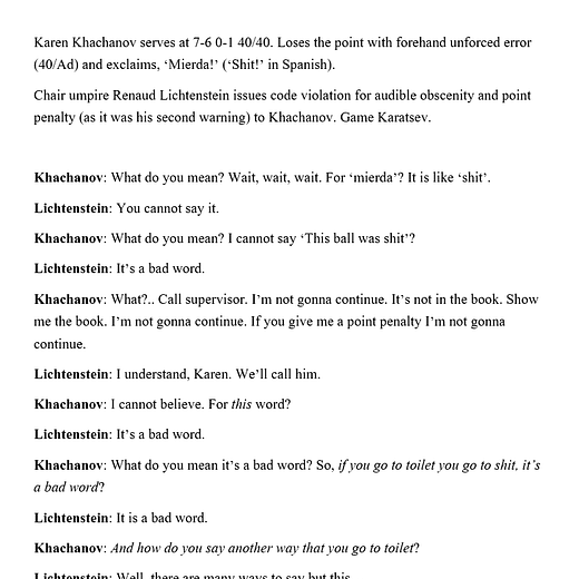 There are lots of odd things in the above exchange. Firstly, Khachanov confusingly asking umpire Renaud Lichtenstein ‘how do you say another way that you go to the toilet’ instead of saying ‘shit’, which not only answered his own question by mentioning the word ‘toilet’ but also seemed to temporarily delete every other word for a restroom/bathroom/toilet from existence. Secondly, supervisor Gerry Armstrong, perhaps befuddled after being asked an unintentionally philosophical question about semantics by Khachanov in the form of ‘who decides if it is a bad word or not?’, replied that ‘the English language’ decides. But that didn’t make much sense either given Khachanov had been penalised for saying ‘mierda’, ie ‘shit’, in Spanish not English. And considering that ‘mierda’ is also not a particularly serious swear word in some Spanish speaking countries you can sort of understand why Khachanov was so nonplussed by the whole thing. Of course in classic tennis fashion the original ‘mierda’ uttered by Khachanov, which likely drew almost no attention from anyone watching the match, was then utterly upstaged by the ensuing discussion with the umpire and supervisor which featured Khachanov loudly saying ‘SHIT’ about three hundred times while trying to understand what the hell was happening, thereby submitting the audience to three hundred times more profanity than if this nonsense had been ignored in the first place. Ten minutes later, at the 3-4 change of ends, the stadium DJ loudly trolled everyone as “♪(YEAH, YEAH) ALL THE CRAZY SHIT I DID TONIGHT, THOSE WILL BE THE BEST MEMORIES♪” blasted out of the speakers, thereby bringing a brown curtain down on the potty-shaped circus. None of the DJ, David Guetta nor Kid Cudi were given audible obscenity warnings.